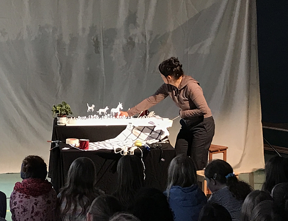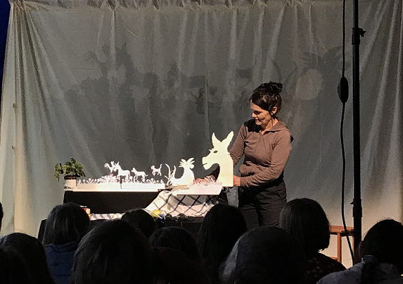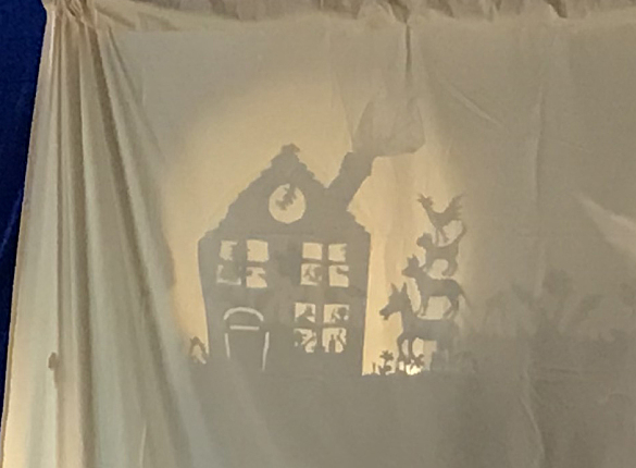 Die erzählte Geschichte der Bremer Stadtmusikanten wurde dabei mit einem Schattentheater und Stabpuppen inszeniert und von Klaviermusik begleitet. So gelang es dem Ensemble, unsere Schüler:innen in den Bann der Geschichte zu ziehen und sie für das Schattentheater zu begeistern!